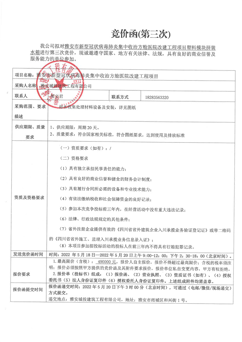 雅安市新型冠狀病毒肺炎集中收治方艙醫(yī)院改建工程項(xiàng)目塑料模塊拼裝水箱競價函(第三次)