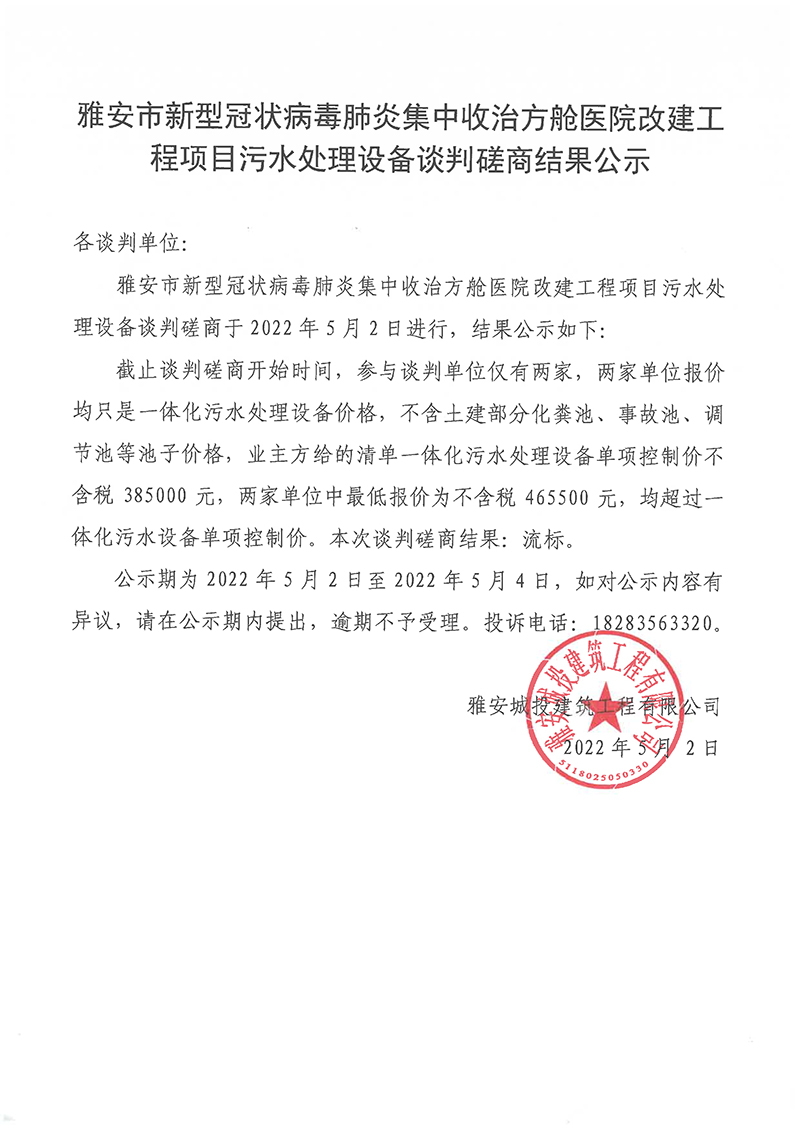 雅安市新型冠狀病毒肺炎集中收治方艙醫(yī)院改建工程項目污水處理設備談判磋商結果公示