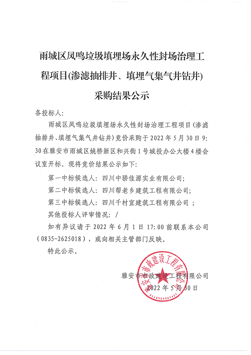 雨城區(qū)鳳鳴垃圾填埋場永久性封場治理工程項(xiàng)目(滲濾抽排井、填埋氣集氣井鉆井)采購結(jié)果公示