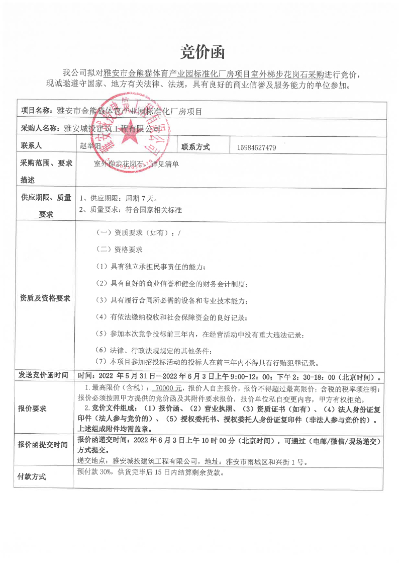 雅安市金熊貓?bào)w育產(chǎn)業(yè)園標(biāo)準(zhǔn)化廠(chǎng)房項(xiàng)目室外梯步花崗石采購(gòu)競(jìng)價(jià)函