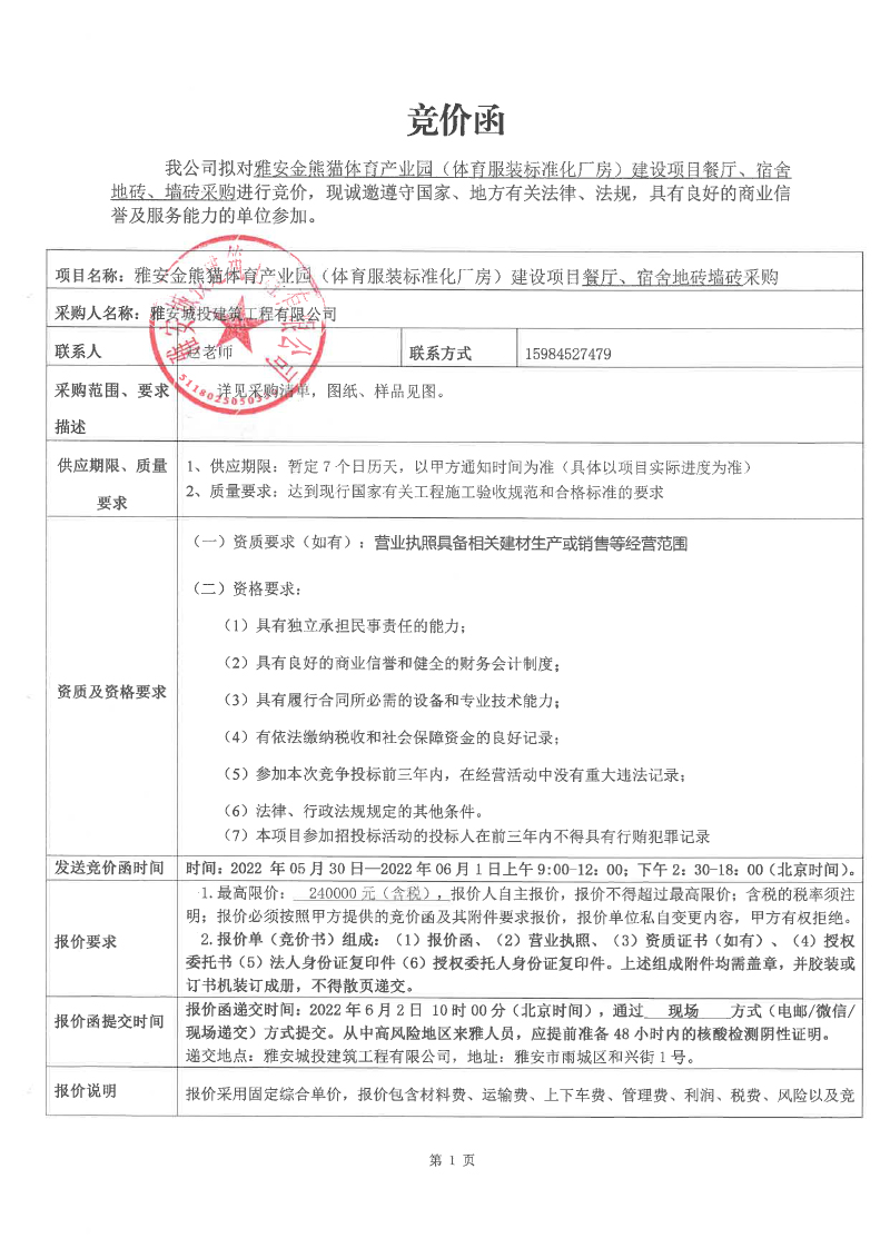 雅安金熊貓?bào)w育產(chǎn)業(yè)園(體育服裝標(biāo)準(zhǔn)化廠房)建設(shè)項(xiàng)目餐廳、宿舍地磚、墻磚競(jìng)價(jià)采購