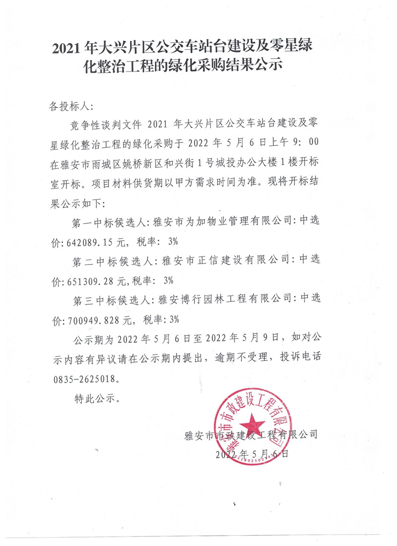 2021年大興片區(qū)公交站臺建設及零星綠地整治工程的綠化采購結果公示