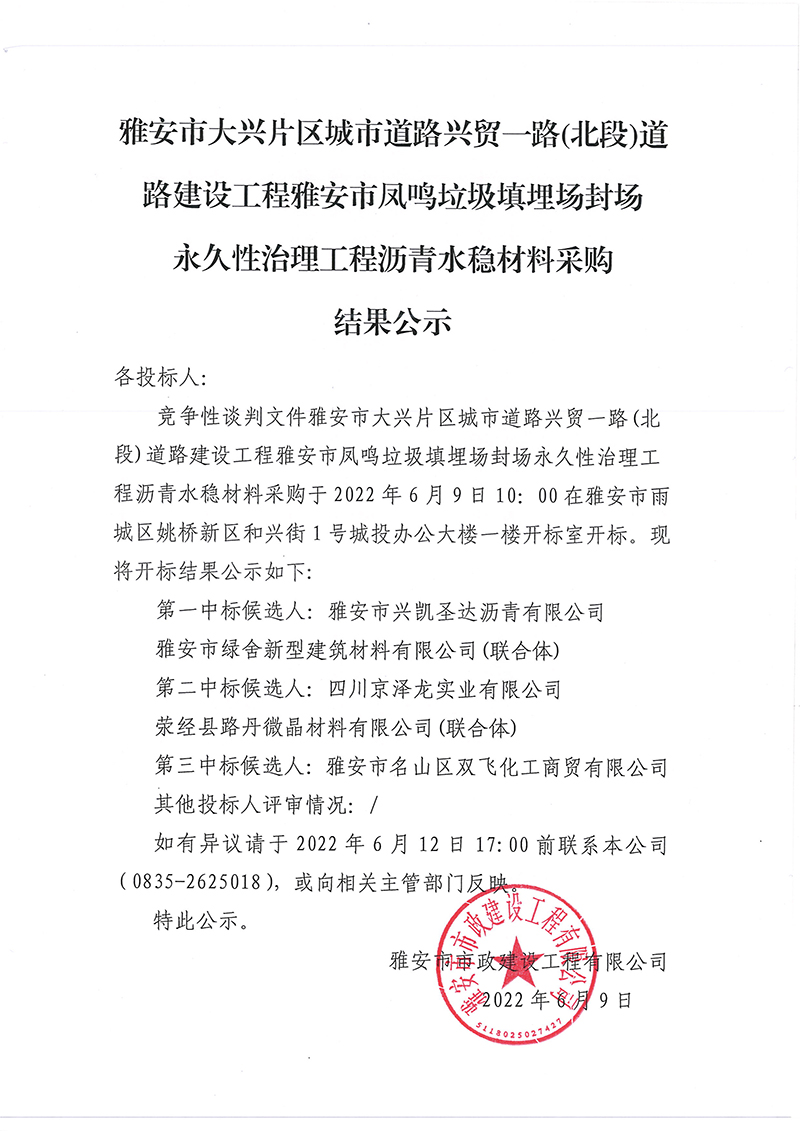 雅安市大興片區(qū)城市道路興貿(mào)一路(北段)道路建設工程雅安市鳳鳴垃圾填埋場封場永久性治理工程瀝青水穩(wěn)材料采購結(jié)果公示