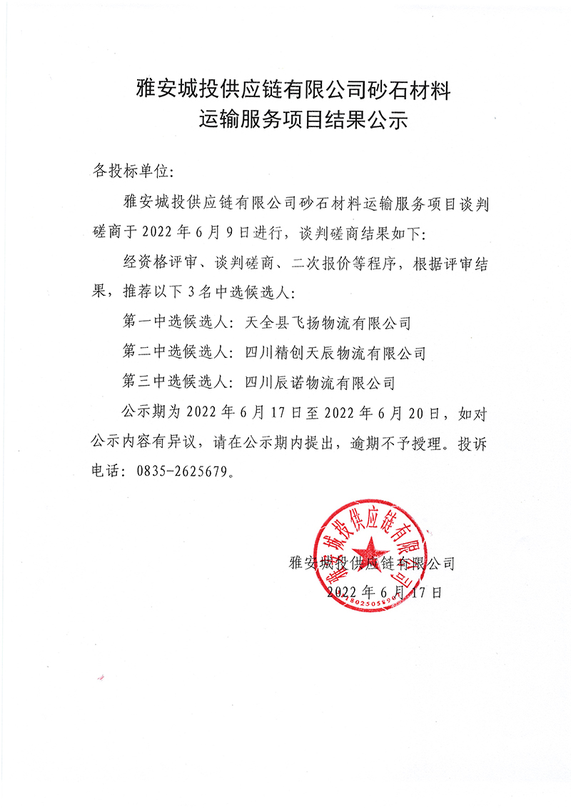 雅安城投供應(yīng)鏈有限公司砂石材料運輸服務(wù)項目結(jié)果公示