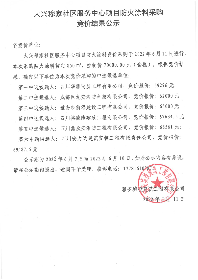 大興穆家社區(qū)服務(wù)中心項目防火涂料采購競價結(jié)果公示