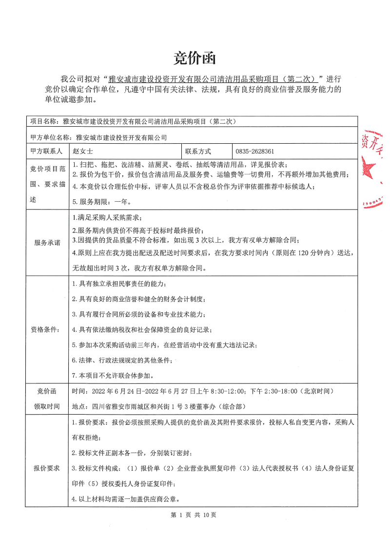 雅安城市建設(shè)投資開發(fā)有限公司 清潔用品采購(gòu)項(xiàng)目(第二次)競(jìng)價(jià)公告