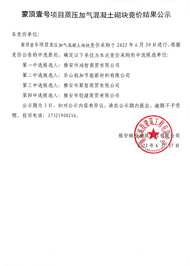 蒙頂壹號項目蒸壓加氣混凝土砌塊采購內容競價結果公示