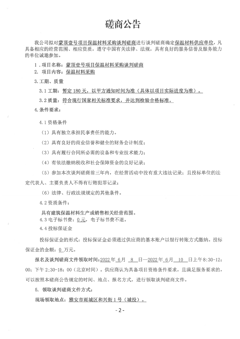 蒙頂壹號(hào)項(xiàng)目保溫材料采購(gòu)談判磋商公告