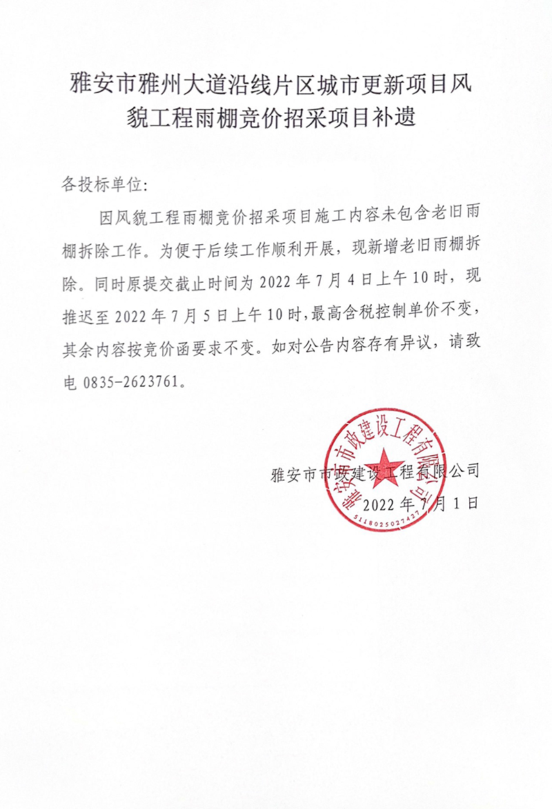 雅安市雅州大道沿線片區(qū)城市更新項(xiàng)目風(fēng)貌工程雨棚競(jìng)價(jià)招采項(xiàng)目補(bǔ)遺