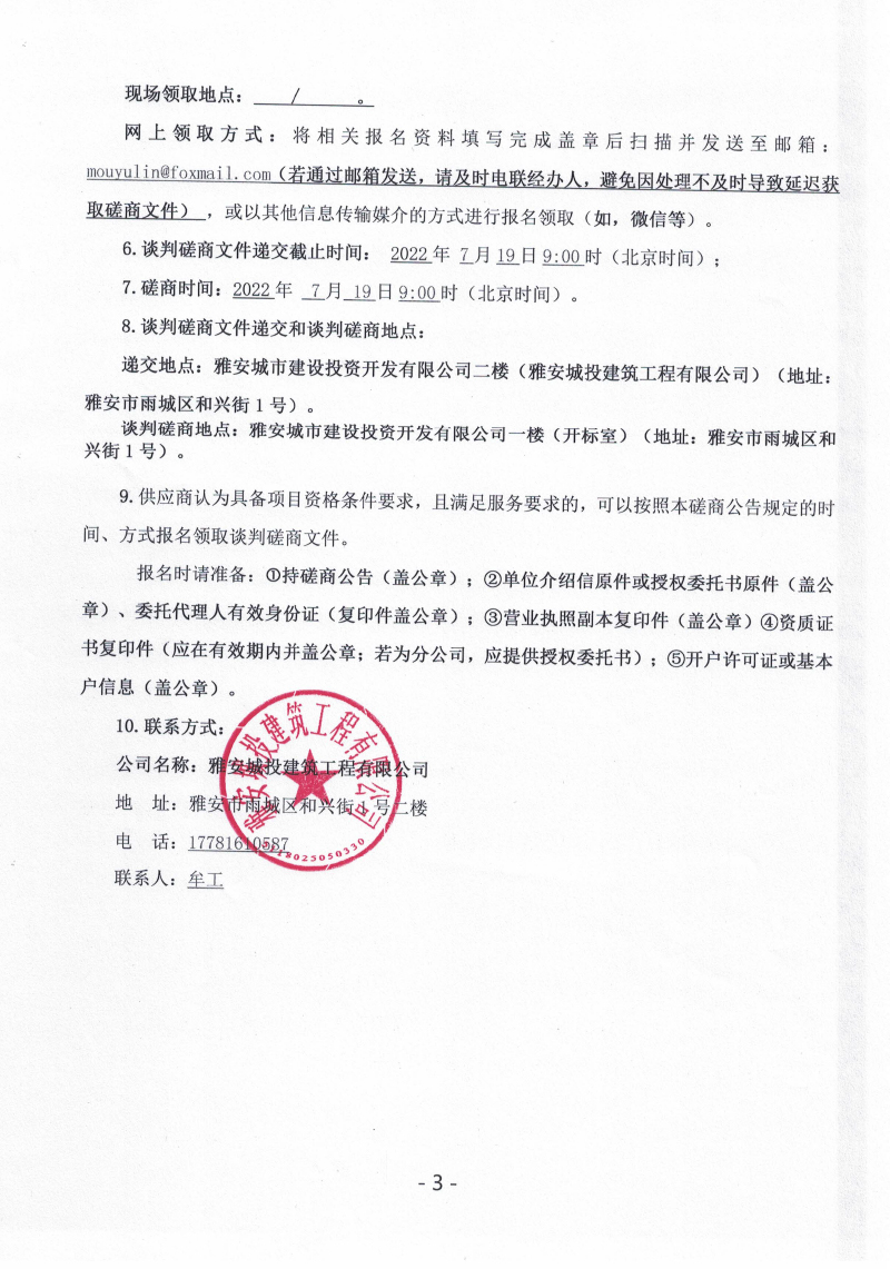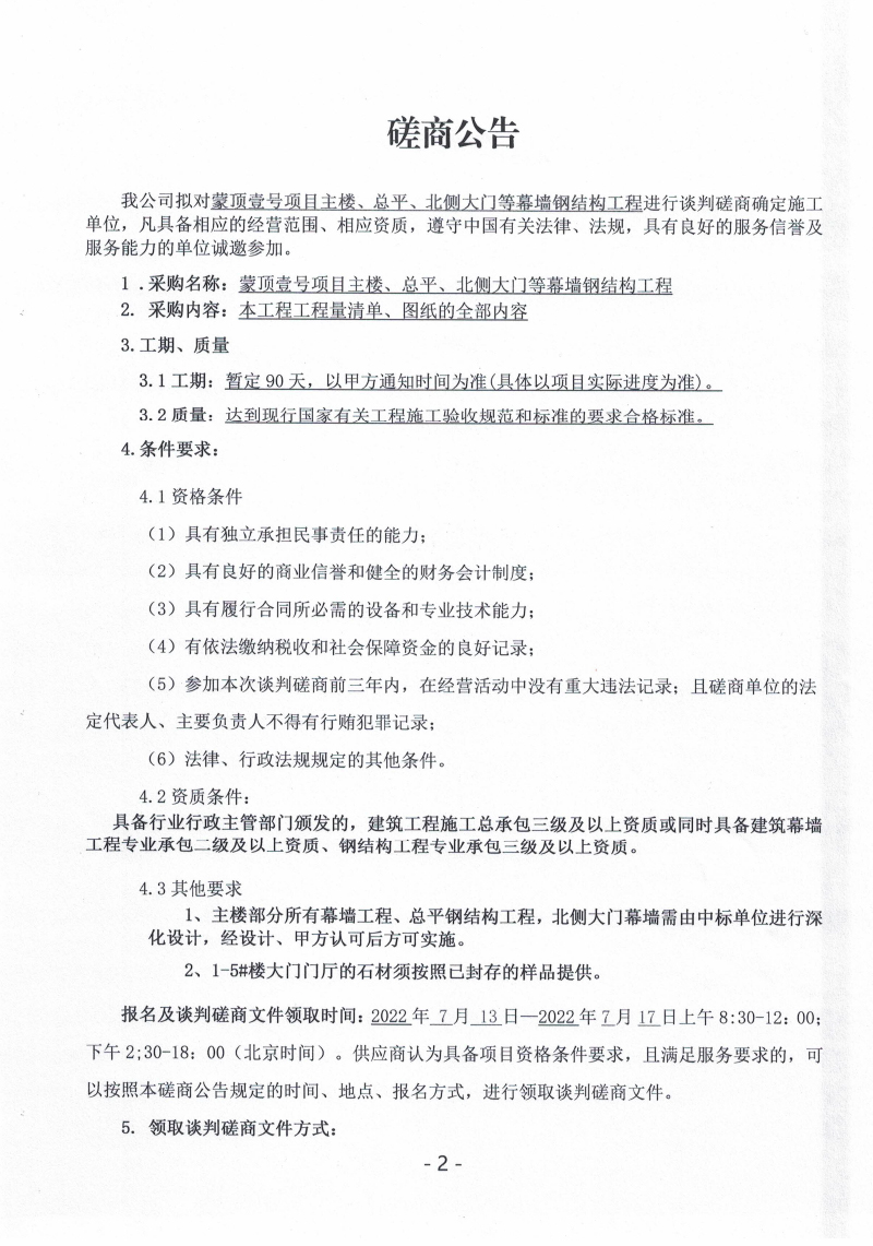 蒙頂壹號項目主樓、總坪、北側大門幕墻鋼結構工程談判磋商公告