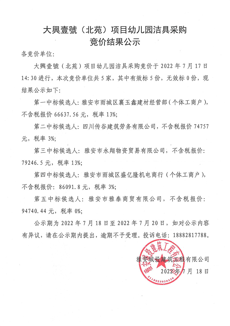 大興壹號(北苑)項(xiàng)目幼兒園潔具采購競價(jià)結(jié)果公示