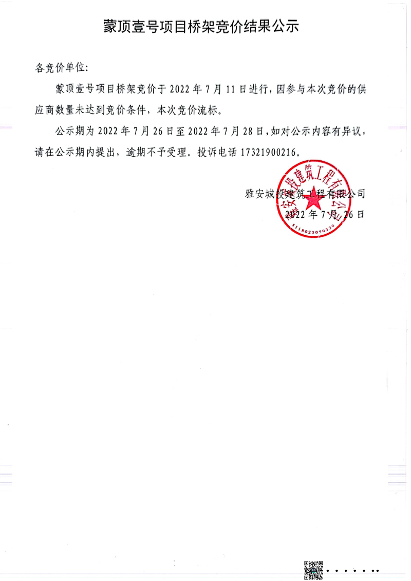 蒙頂壹號項目橋架競價結(jié)果公示