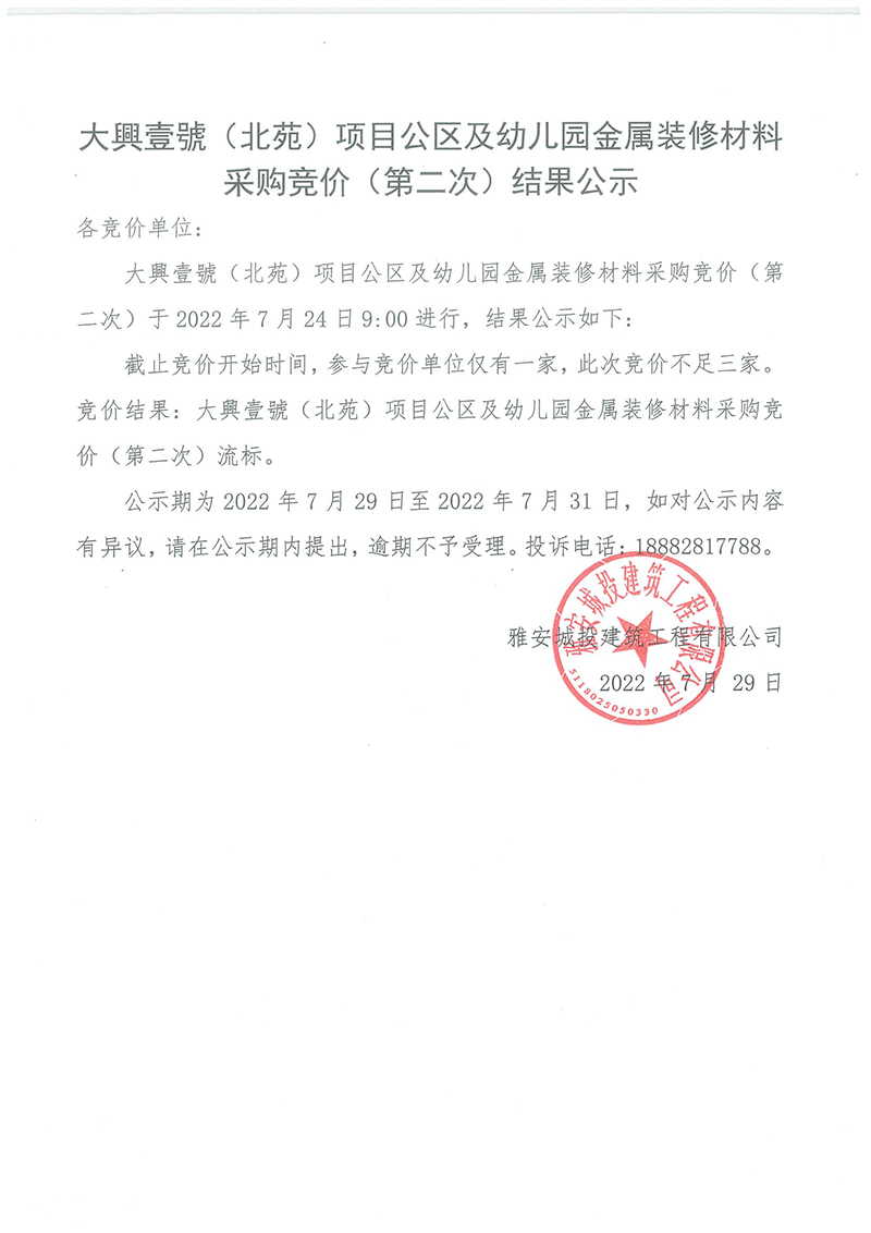 大興壹號(北苑)公區(qū)與幼兒園金屬裝修材料采購競價(第二次)結果公示