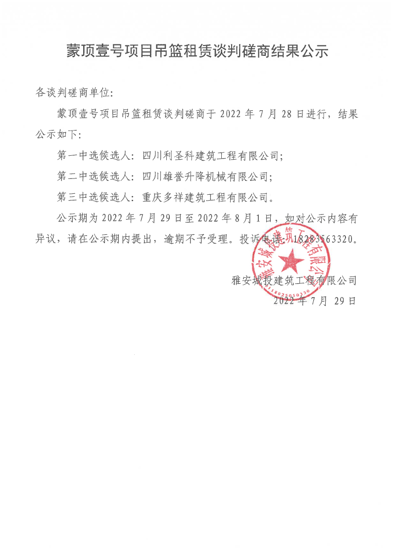 蒙頂壹號項目吊籃租賃談判磋商結(jié)果公示