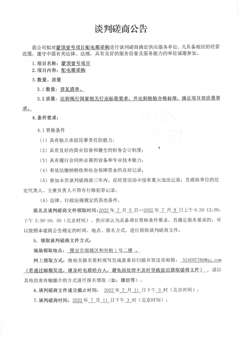 蒙頂壹號(hào)項(xiàng)目配電箱采購(gòu)談判磋商公告