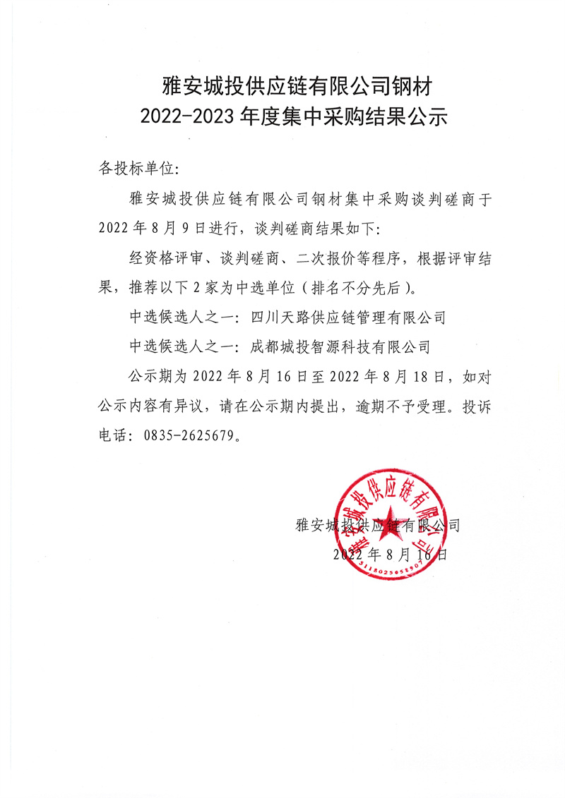雅安城投供應(yīng)鏈有限公司鋼材2022-2023年度集中采購結(jié)果公示