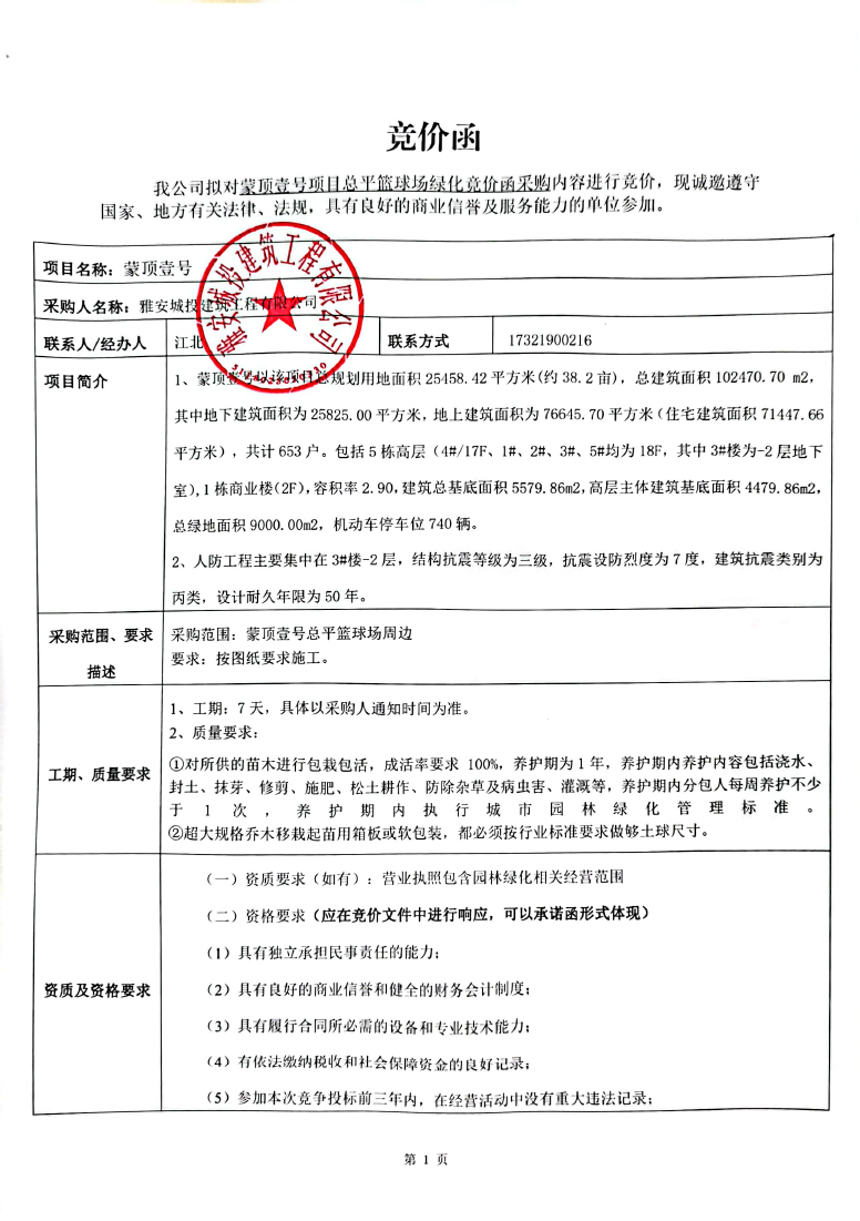 蒙頂壹號項目總平籃球場綠化競價公告