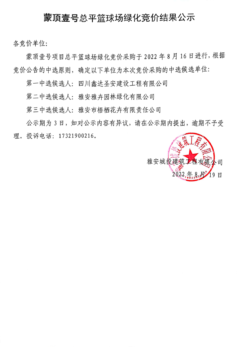 蒙頂壹號項目總平籃球場綠化競價結(jié)果公示
