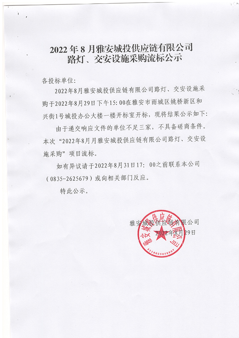2022年8月雅安城投供應鏈有限公司路燈、交安設施采購流標公示