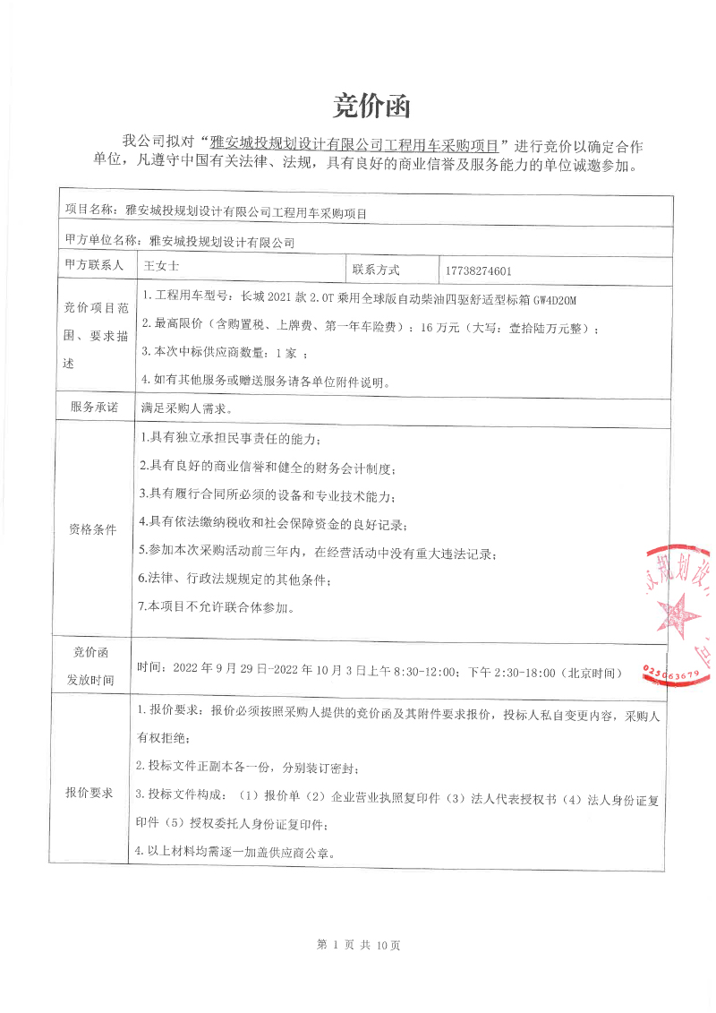 雅安城投規(guī)劃設(shè)計(jì)有限公司工程用車(chē)采購(gòu)項(xiàng)目競(jìng)價(jià)公告