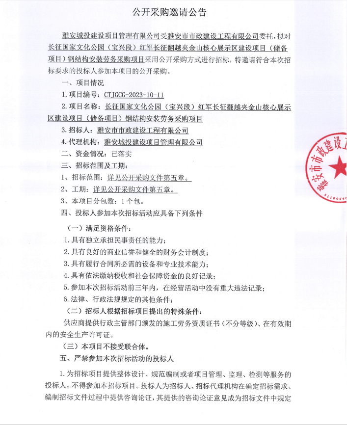 長征國家文化公園(寶興段)紅軍長征翻越夾金山核心展示區(qū)建設(shè)項(xiàng)目(儲(chǔ)備項(xiàng)目)鋼結(jié)構(gòu)安裝勞務(wù)采購項(xiàng)目公開采購邀請公告