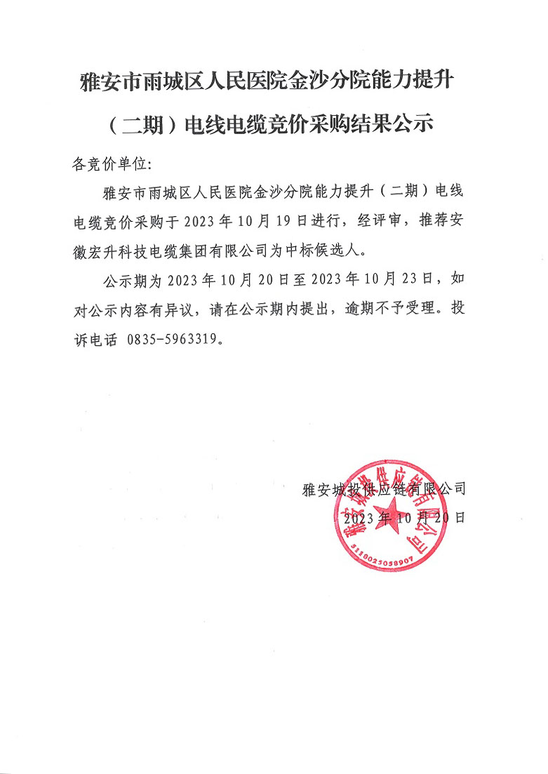 雅安市雨城區(qū)人民醫(yī)院金沙分院能力提升(二期)電線電纜競價采購結果公示