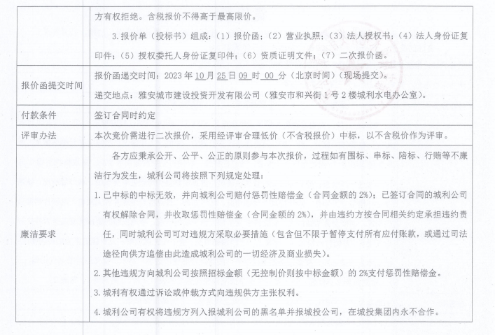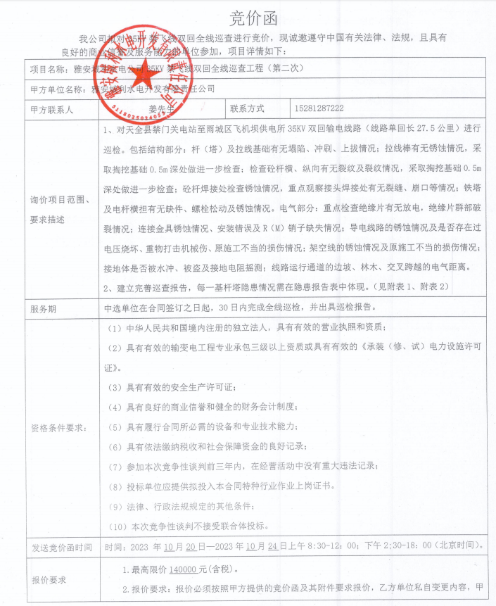 雅安城利水電公司35KV禁飛線(xiàn)雙回全線(xiàn)巡查工程(第二次)競(jìng)價(jià)公告
