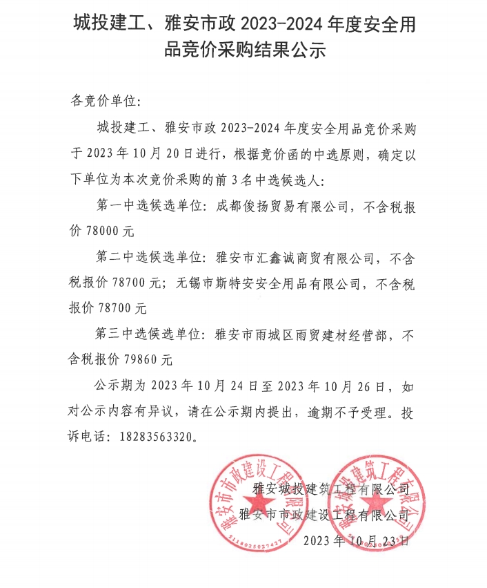 城投建工、雅安市政2023-2024年度安全用品采購(gòu)結(jié)果公示