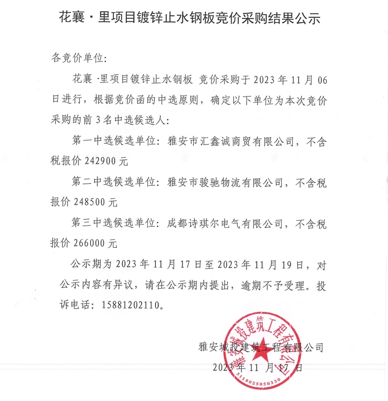 花襄·里項(xiàng)目鍍鋅止水鋼板競價采購結(jié)果公示
