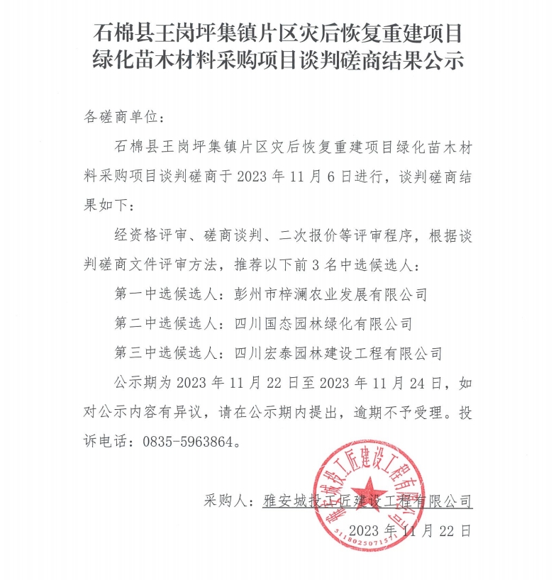 石棉縣王崗坪集鎮(zhèn)片區(qū)災(zāi)后恢復(fù)重建項(xiàng)目綠化苗木材料采購(gòu)項(xiàng)目談判磋商結(jié)果公示