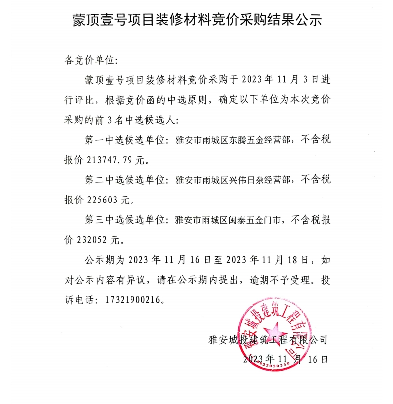 蒙頂壹號(hào)項(xiàng)目裝修材料競(jìng)價(jià)采購結(jié)果公示
