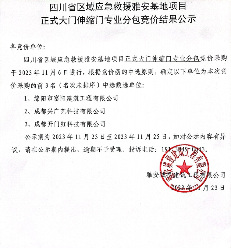 四川省區(qū)域應(yīng)急救援雅安基地項目正式大門伸縮門專業(yè)分包競價結(jié)果公示