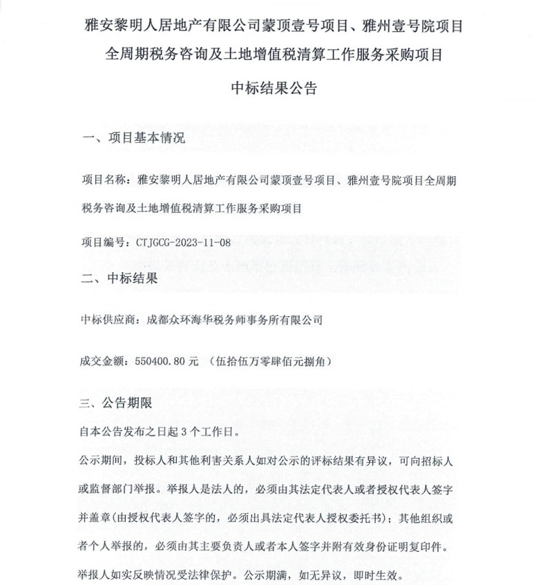 雅安黎明人居地產(chǎn)有限公司蒙頂壹號(hào)項(xiàng)目、雅州壹號(hào)院項(xiàng)目全周期稅務(wù)咨詢及土地增值稅清算工作服務(wù)采購項(xiàng)目中標(biāo)結(jié)果公告