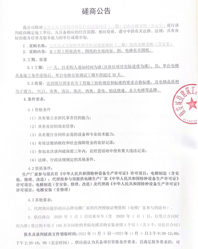 寶興縣靈關(guān)保障性租賃住房建設(shè)項(xiàng)目(二期)室內(nèi)電梯采購(gòu)(含安裝)談判磋商公告