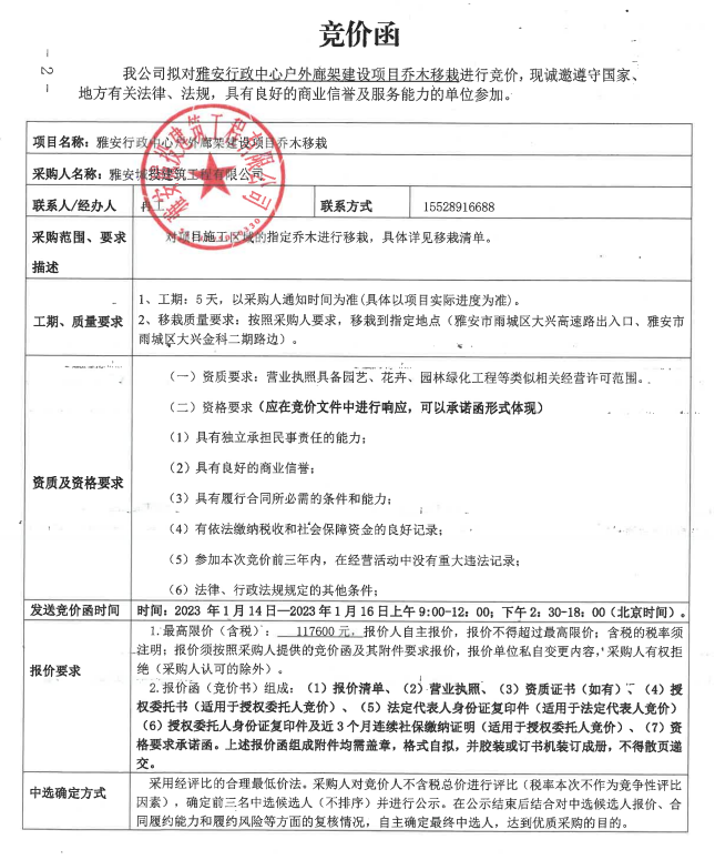 雅安行政中心戶外廊架建設(shè)項(xiàng)目喬木移栽競(jìng)價(jià)公告