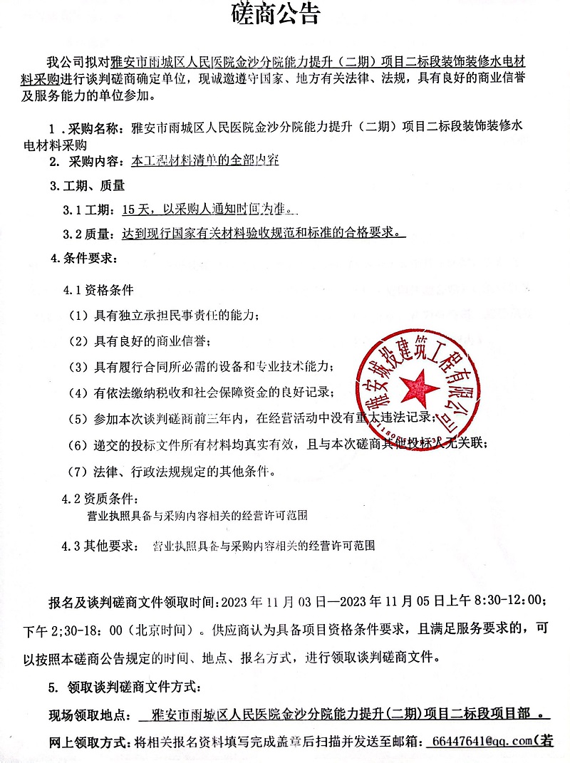 雅安市雨城區(qū)人民醫(yī)院金沙分院能力提升(二期)項目二標(biāo)段裝飾裝修水電材料采購談判磋商公告