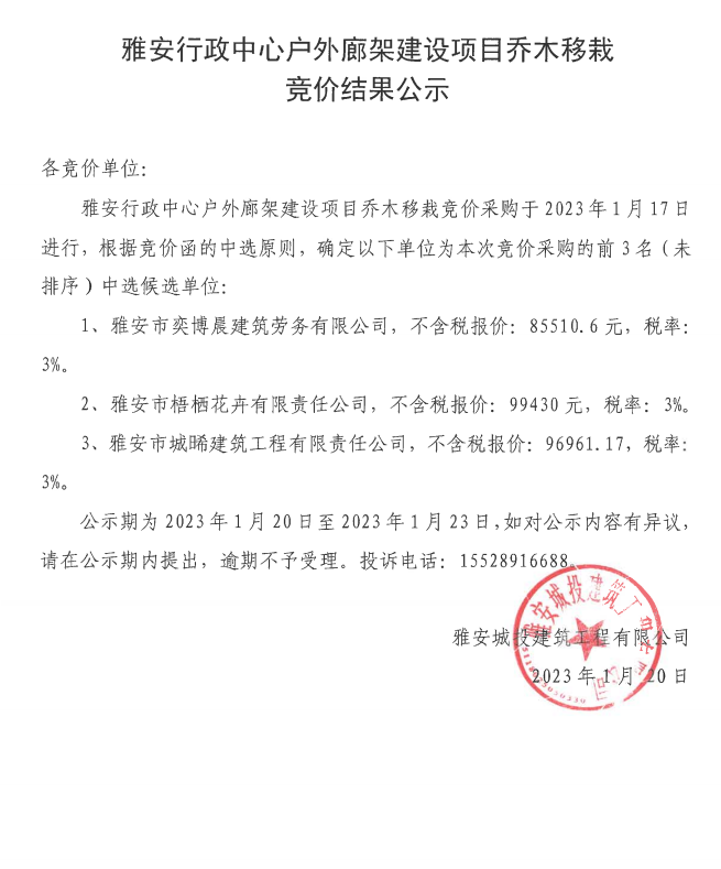 雅安行政中心戶外廊架建設項目喬木移栽競價結(jié)果公示