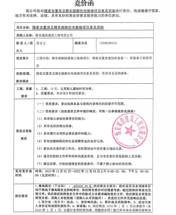 穆家安置房及雅東麗都住宅裝修項(xiàng)目家具采購競(jìng)價(jià)公告