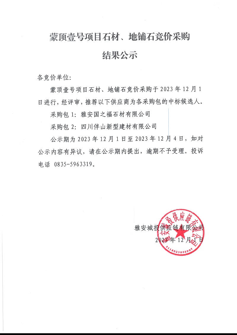 蒙頂壹號項目石材、地鋪石競價采購結果公示