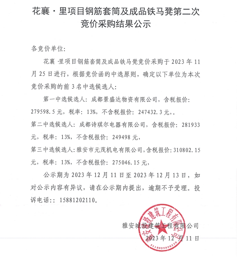 花襄·里項(xiàng)目鋼筋套筒及成品鐵馬凳第二次競價(jià)采購結(jié)果公示