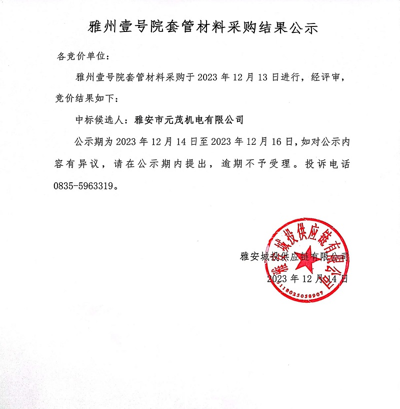 雅州壹號院套管材料采購結(jié)果公示