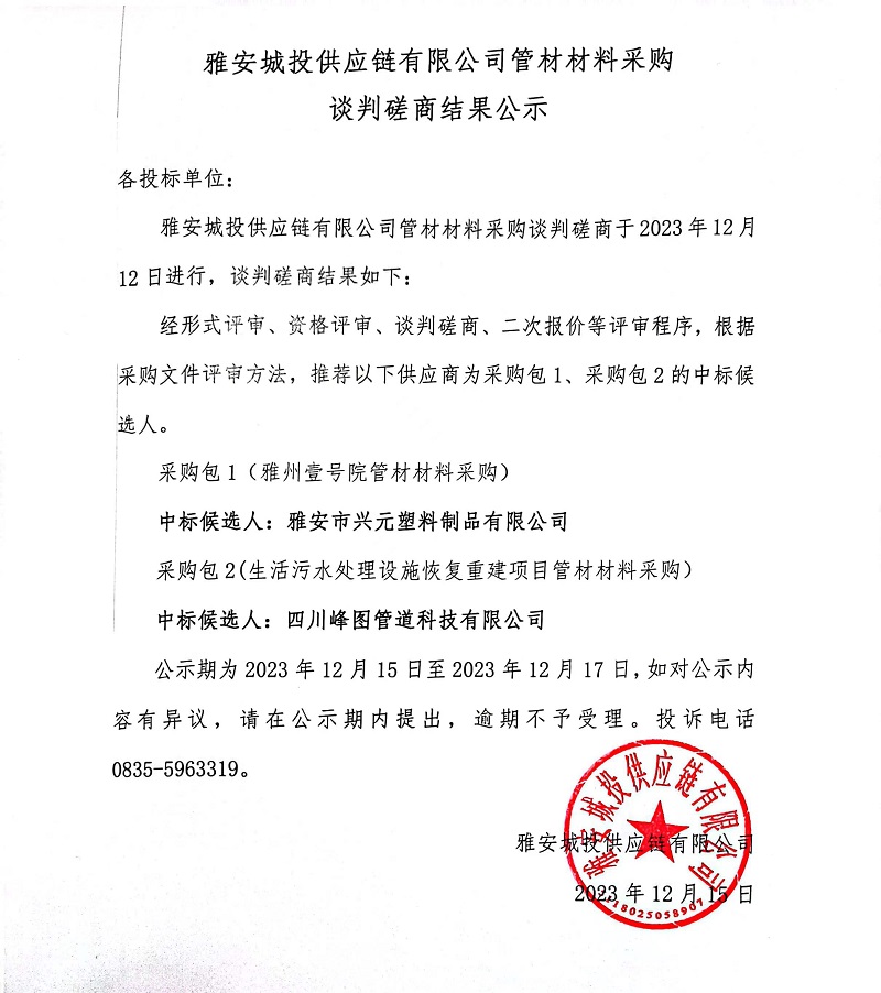 雅安城投供應(yīng)鏈有限公司管材材料采購談判磋商結(jié)果公示