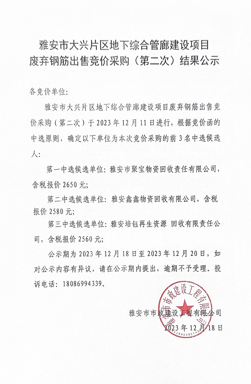 雅安市大興片區(qū)地下綜合管廊建設(shè)項(xiàng)目廢棄鋼筋出售競(jìng)價(jià)采購(gòu)(第二次)結(jié)果公示