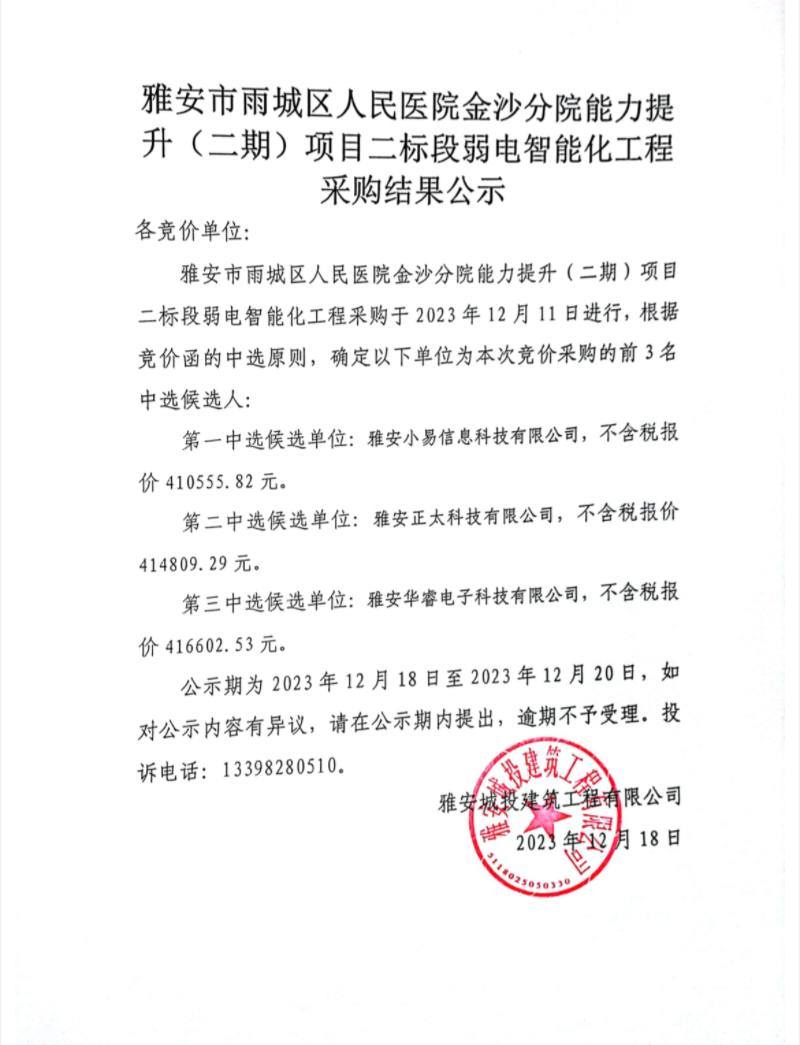 雅安市雨城區(qū)人民醫(yī)院金沙分院能力提升(二期)項(xiàng)目二標(biāo)段弱電智能化工程采購結(jié)果公示