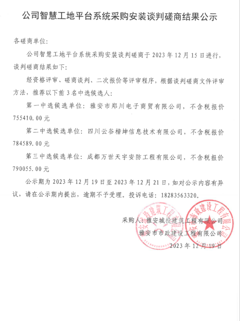 公司智慧工地平臺(tái)系統(tǒng)采購(gòu)安裝談判磋商結(jié)果公示
