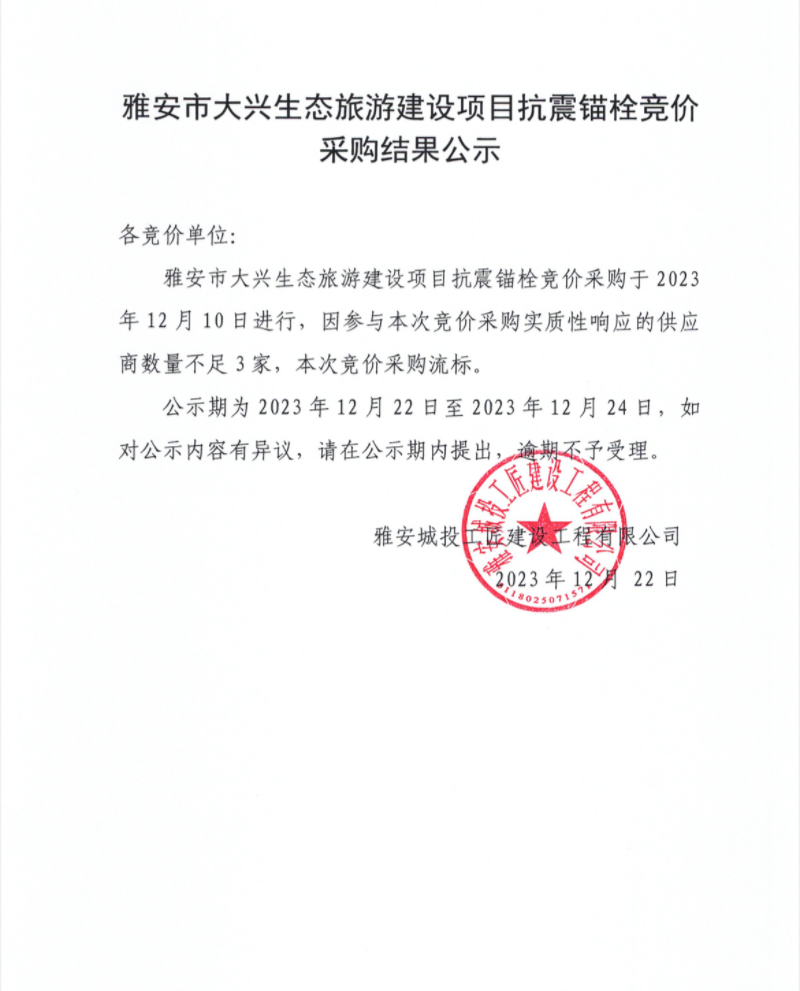 雅安市大興生態(tài)旅游建設(shè)項目抗震錨栓競價采購結(jié)果公示