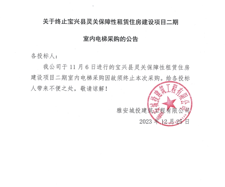 關(guān)于終止寶興縣靈關(guān)保障性租賃住房建設(shè)項(xiàng)目二期室內(nèi)電梯采購的公告