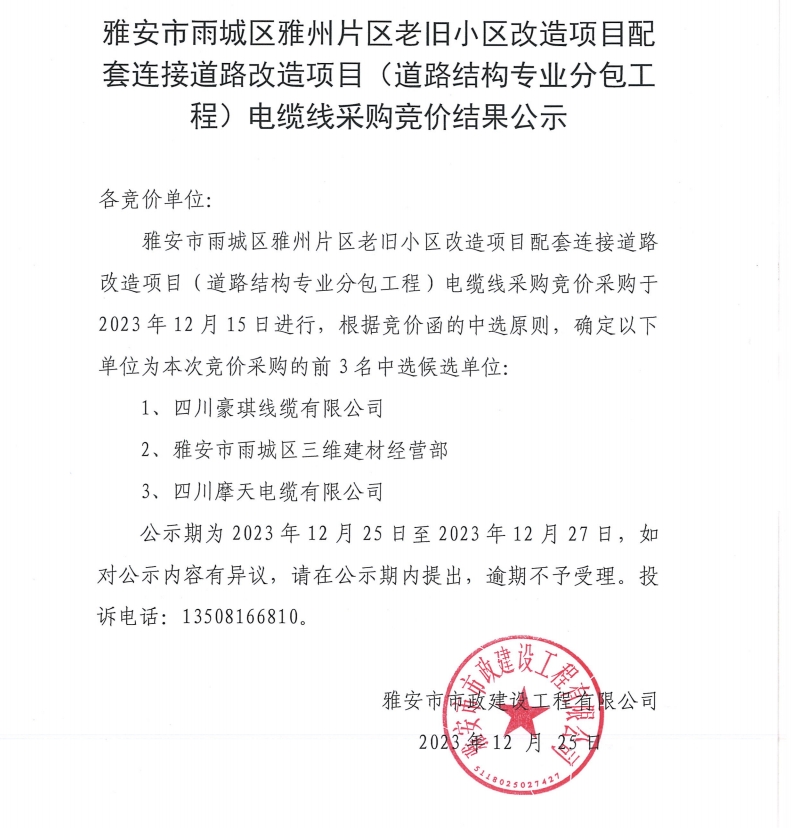 雅安市雨城區(qū)雅州片區(qū)老舊小區(qū)改造項(xiàng)目配套連接道路改造項(xiàng)目(道路結(jié)構(gòu)專業(yè)分包工程)電纜線采購競價(jià)結(jié)果公示
