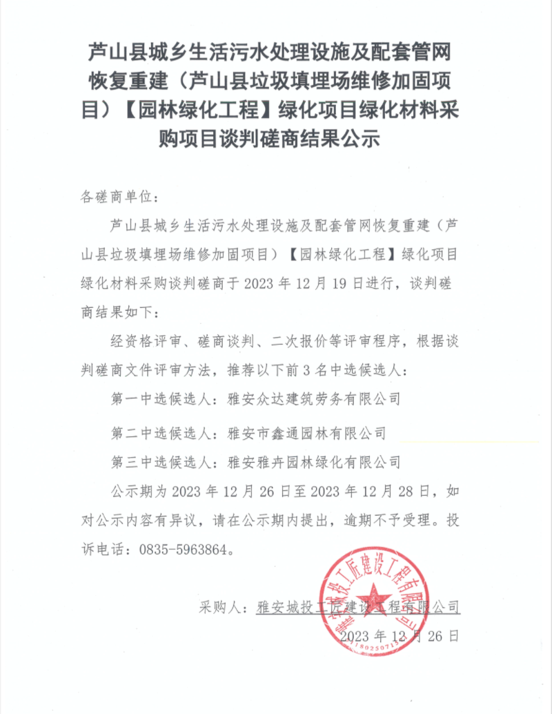 蘆山縣城鄉(xiāng)生活污水處理設施及配套管網(wǎng)恢復重建(蘆山縣垃圾填埋場維修加固項目)【園林綠化工程】綠化項目綠化材料采購項目談判磋商結果公示