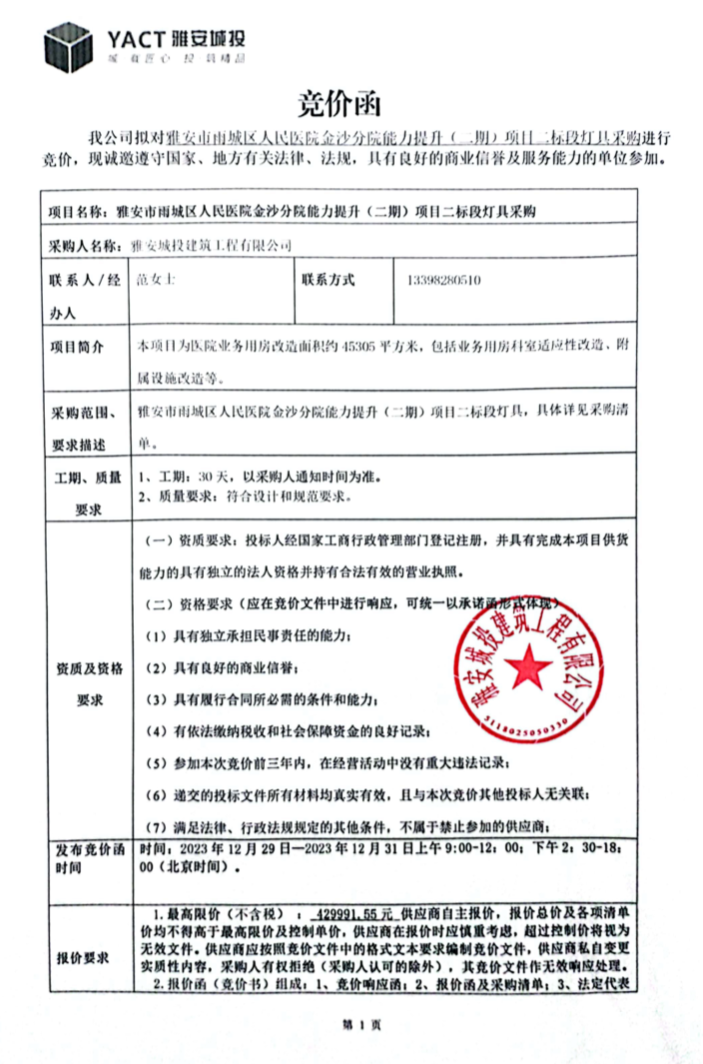 雅安市雨城區(qū)人民醫(yī)院分院能力提升(二期)項目二標段燈具采購競價公告